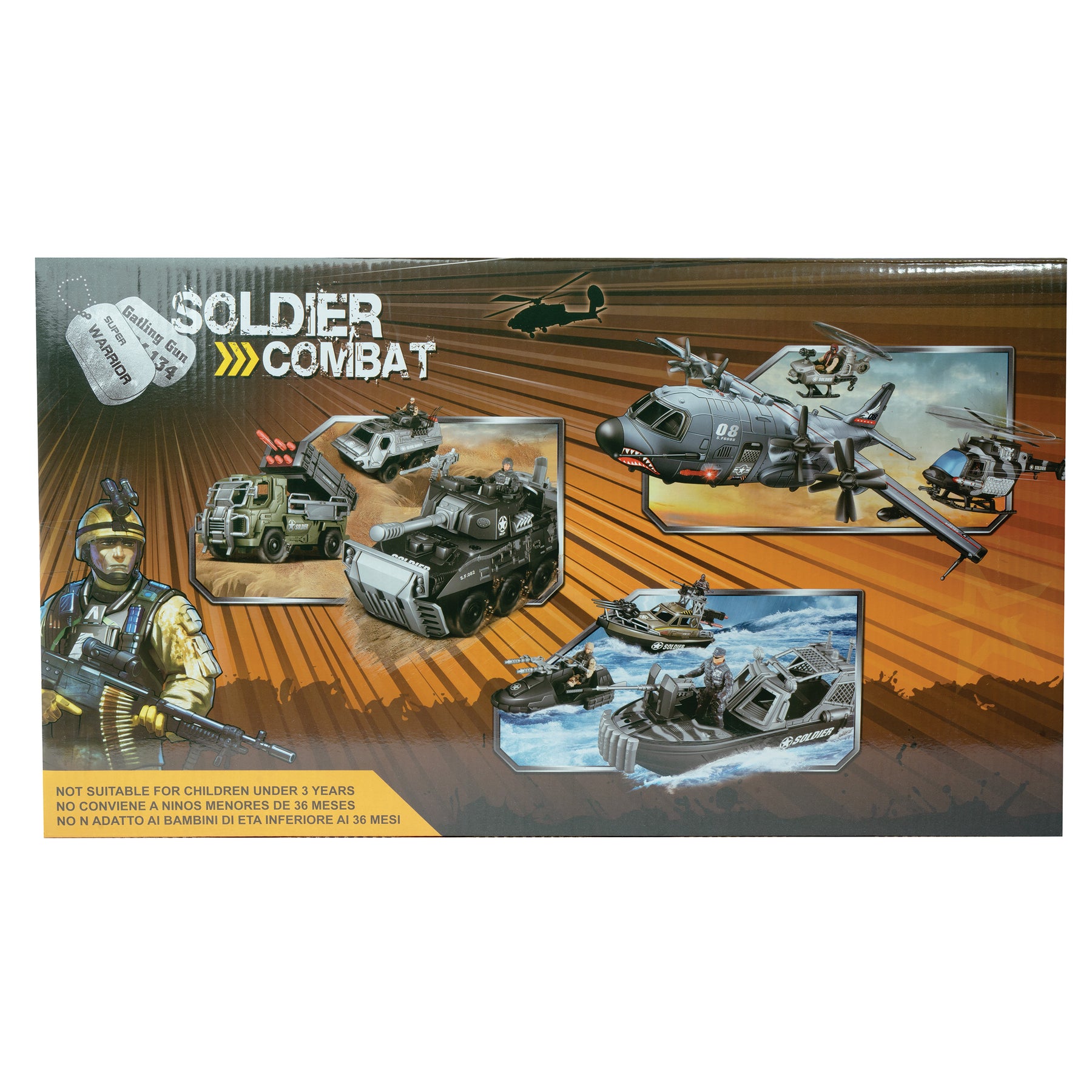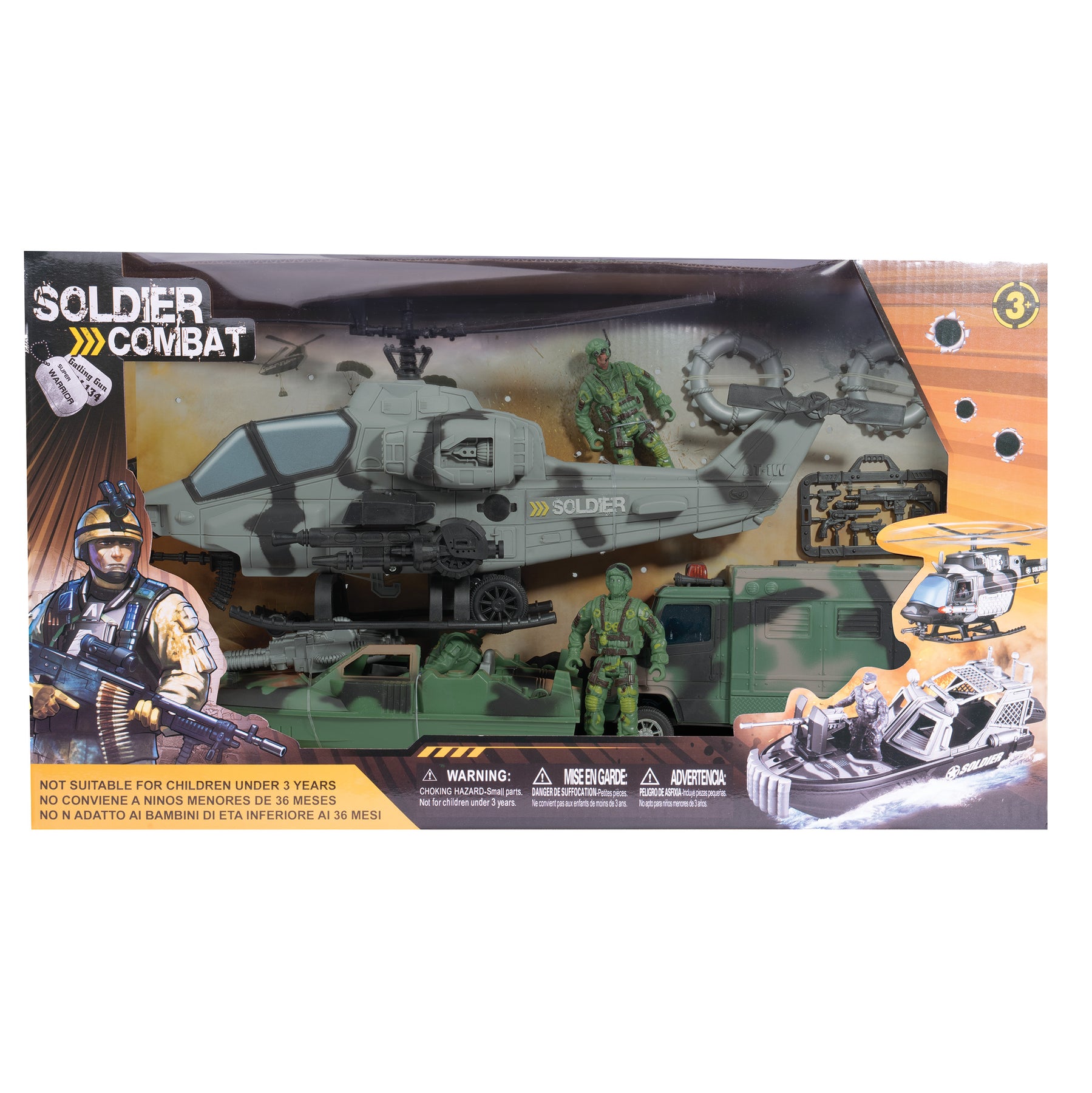 | Components | 15 Inch Helicopter, Truck, Boat, 3 Soldiers, 2 Guns, 2 Life Preservers |