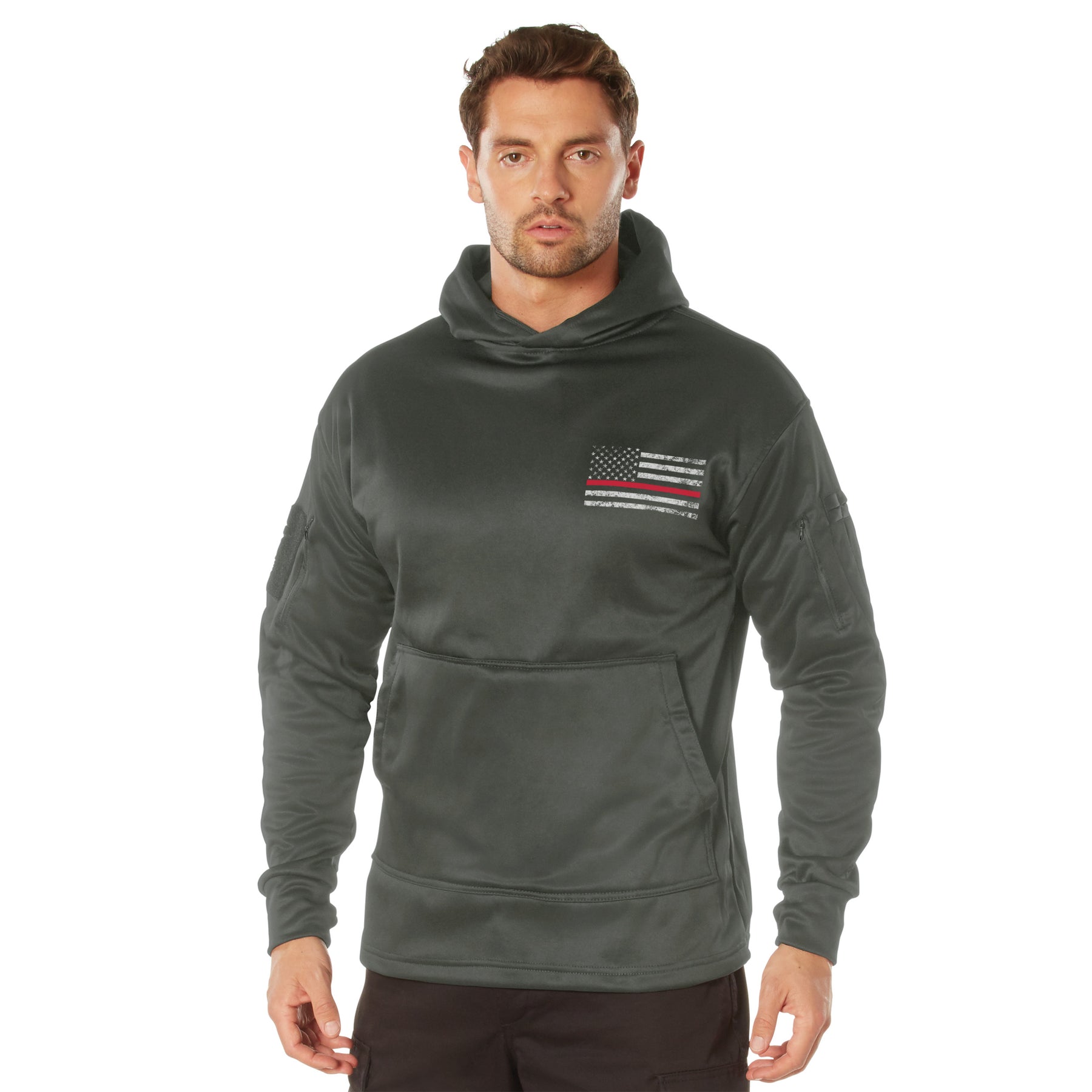 Our Concealed Carry Thin Red Line Hoodie features a distressed American Flag graphic on the left chest and across the back, showing respect and support for police and law enforcement officials. This hoodie sweatshirt also offers best-in-class discrete carry while providing unbeatable warmth and comfort. Whether you're out on a weekend trip or just running errands around town, this hoodie has everything you need to stay comfortable and prepared. Discrete & Fast: The passthrough kangaroo pocket allows for quick and easy access to your IWB for appendix carry. In addition, the 8.25 inch internal vertical access point ensures that most standard EDC (Everyday Carry) essentials will fit comfortably. Staying Cool and Dry: Made of 100% polyester, these CCW hoodies wick sweat and moisture away for optimum comfort. Featuring our rapid moisture control fabric, sweat is swiftly transferred to the top layer, allowing for a quick dry. This prevents sweat from soaking through the moisture-wicking hoodie and back into your undershirt, allowing you to move freely without your clothing sticking to you. These comfortable hoodies are perfect for both normal everyday wear and for those who work in public safety. Secure Storage: The pullover hoodie also features two zippered sleeve pockets with wire passthrough ports, allowing you to safely tuck away your phone, wallet, or other everyday carry items. The right sleeve includes a dual pen pocket for keeping writing utensils, while the left sleeve features a loop panel for adding morale and flag patches. Warm & Comfortable: With a soft fleece lining, these pullover hooded sweatshirts offer all-day (and all-night) comfort. The drawstring hood keeps your head and neck warm while protecting you against cold wind and rain. The built-in thumbholes preserve your hands’ heat without sacrificing your mobility and range of motion. A Helping Hand: Proceeds from the sale of our Thin Red Line items benefit the families of fallen first responders through our partnership with Answer The Call, also known as the New York Police and Fire Widows’ and Children’s Benefit Fund. Discreetly Carry in Confidence: Rothco stands out as the leader in concealed carry clothing and accessories. With a rich heritage spanning over 7 decades, we have honed our expertise in crafting durable and effective CCW gear. Our extensive range of products, including apparel, bags, and gear, showcases a diverse selection of specialized concealed carry items. From public safety and military personnel, to privately armed citizens, Rothco is the go-to brand for concealed carry apparel and gear.