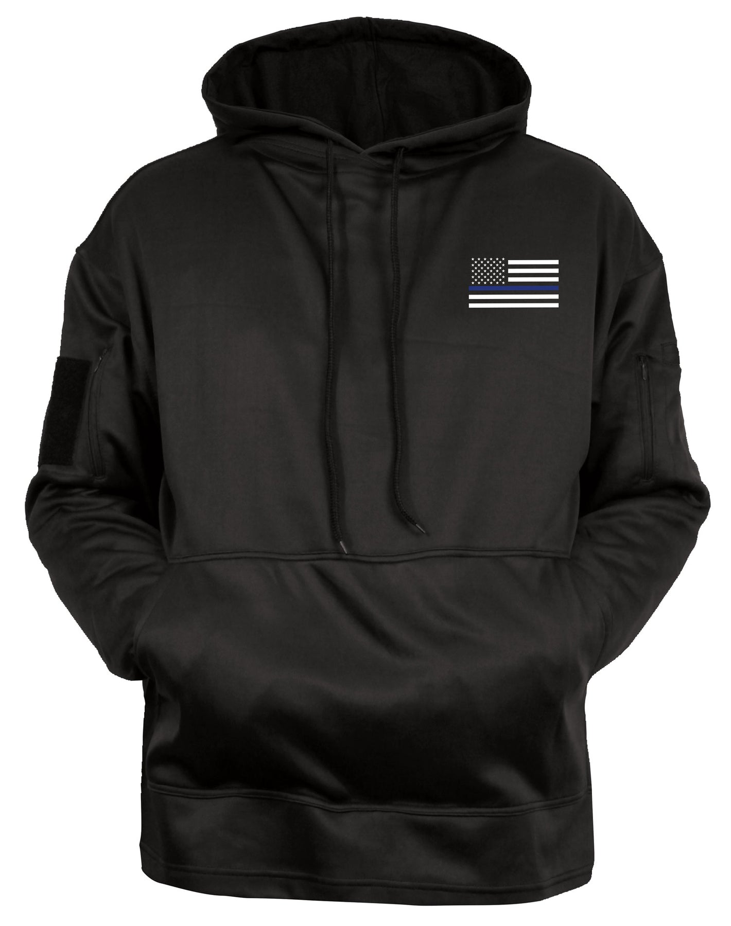 Rothco’s Honor and Respect Thin Blue Line Concealed-Ops Hoodie featurs Thin Blue Line flag graphics on the front and back, this hoodie combines style, functionality, and comfort. The large pass-through kangaroo pocket provides easy access to a waistband holster or appendix carry. Zippered pockets on both sleeves offer additional storage, with a loop patch on the right sleeve and 2 pen pockets on the left. The zippered left sleeve pocket includes a wire pass-through port for headphones. Thumb holes in the cuffs add extra coverage and prevent the sleeves from riding up. Made from a comfortable, moisture-wicking performance material, this hoodie is perfect for daily wear. Proceeds from this purchase benefit families of fallen first responders, allowing you to show your support while making a difference.